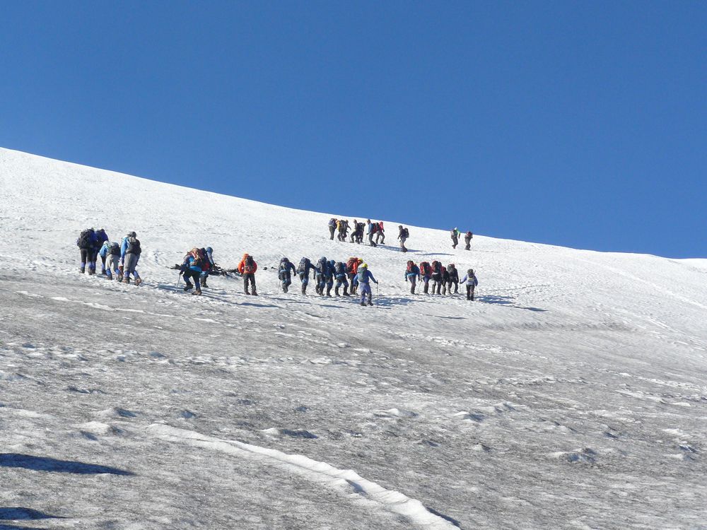 La partie enneigée ou plutôt glacée est plus difficile que la précédente, plus on avance, plus la pente devient ardue et le vent froid plus incisif. Le sommet paraît proche visuellement mais comme on avance en zig-zag, on sait tous qu'il nous reste quelques heures de marche. Je commence à sentir mes mollets et mes cuisses mais pas question de m'arrêter là! Une fois de plus les paysages me rappelle pourquoi je suis ici, en train de grimper et peu importe si l'ascension paraît interminable, j'irai jusqu'au bout!