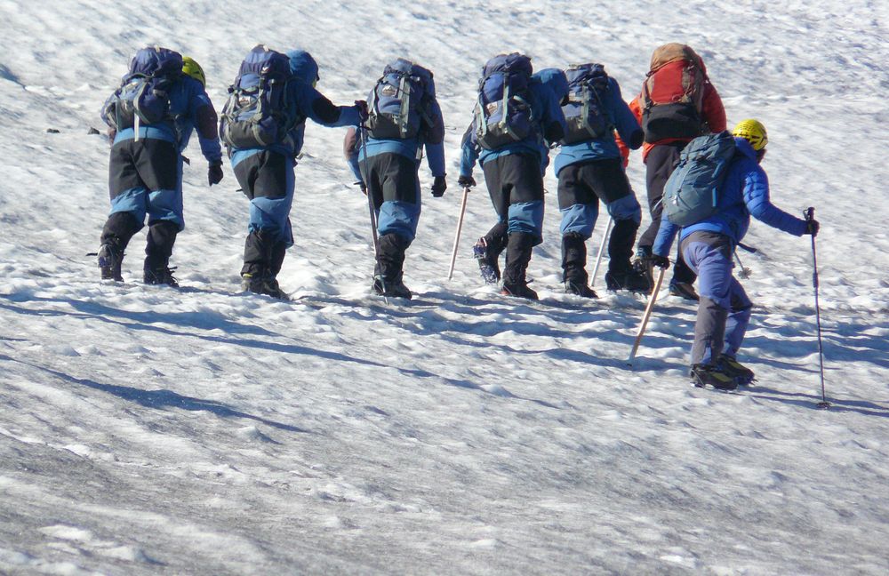La vue magnifique me remotive et je me sens d'attaque pour la suite! Après la mini pause banane/eau/photo, on repart, comme on a toujours pas rejoint le reste du groupe (tu m'étonnes John!), le guide conserve un rythme soutenu, c'est même un peu plus rapide car cette partie est beaucoup facile. A peu près une heure plus tard, on atteint les premières glaces et on fait une nouvelle pause. Daniel profite de ce moment pour nous expliquer comment chausser les crampons, utiliser le piolet et que faire en cas de chutes. Bizarrement, j'étais beaucoup plus attentif pendant les explications!